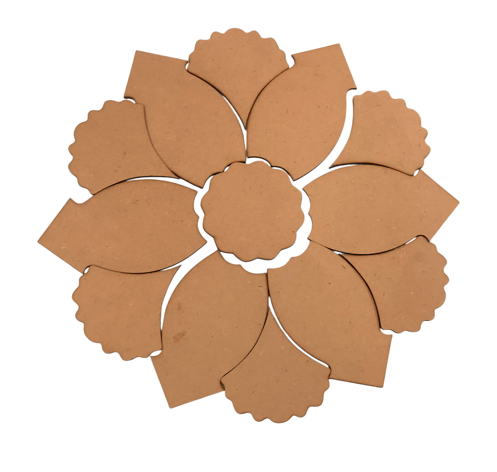 Create stunning rangoli designs effortlessly with this 16 inch pre-cut MDF rangoli base. Designed in a floral pattern with petal-shaped cutouts, it’s perfect for Diwali, weddings, pujas, and festive occasions. You can decorate it with colors, mirrors, beads, paints, or lights to make your space look vibrant and artistic.