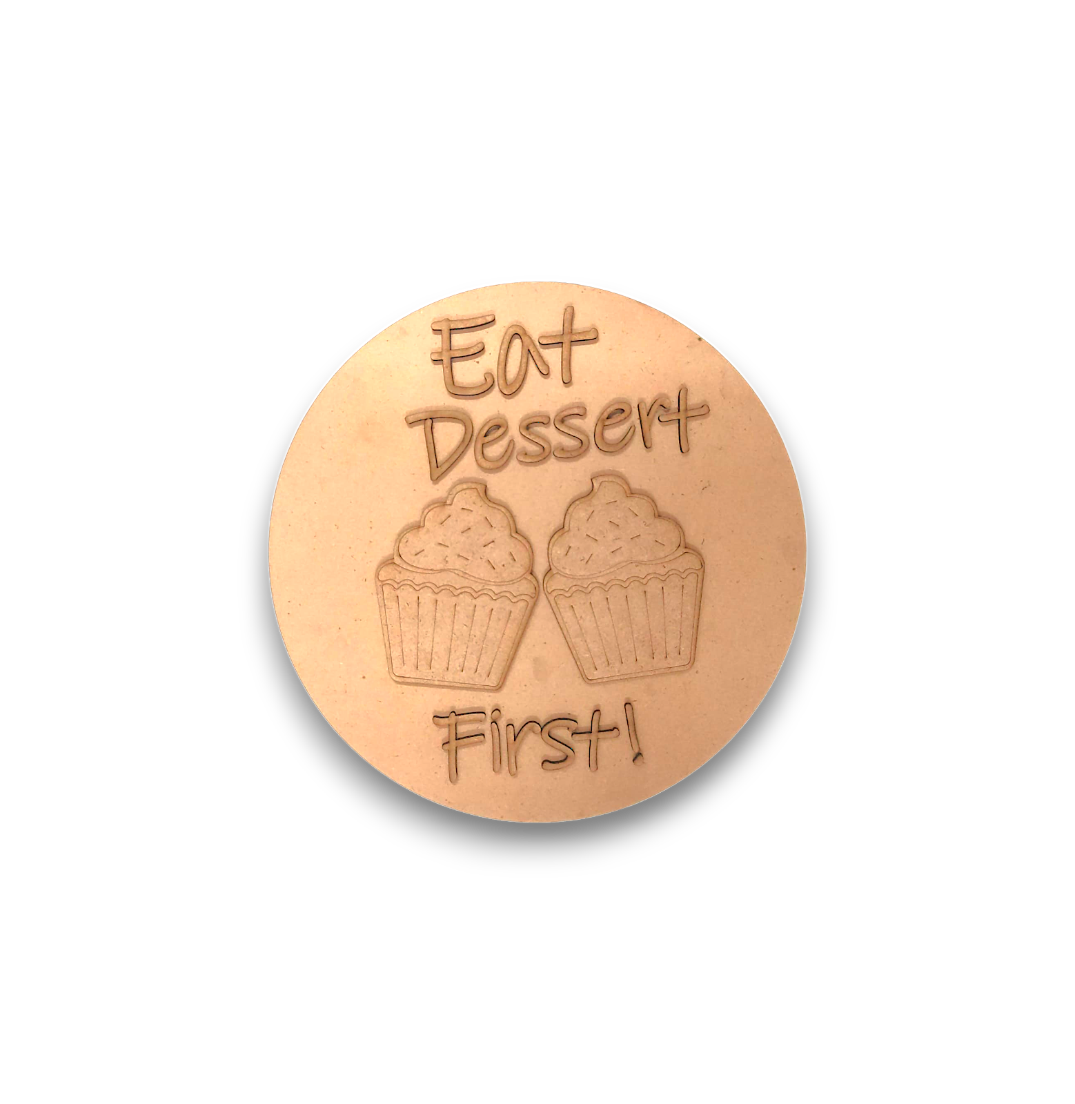 - Design: Engraved “Eat Dessert First!” quote with cupcake