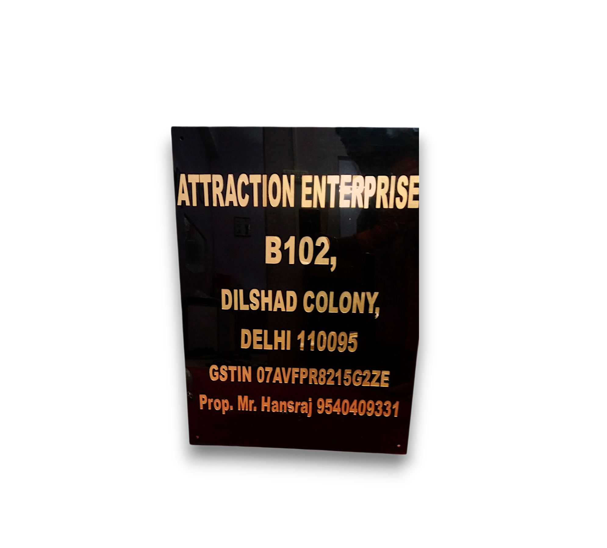 Upgrade your office or shop entrance with this Premium Acrylic Business Name Plate, featuring a glossy black background and bold golden lettering. Designed for professional visibility, this board displays company details clearly with a clean and modern finish.