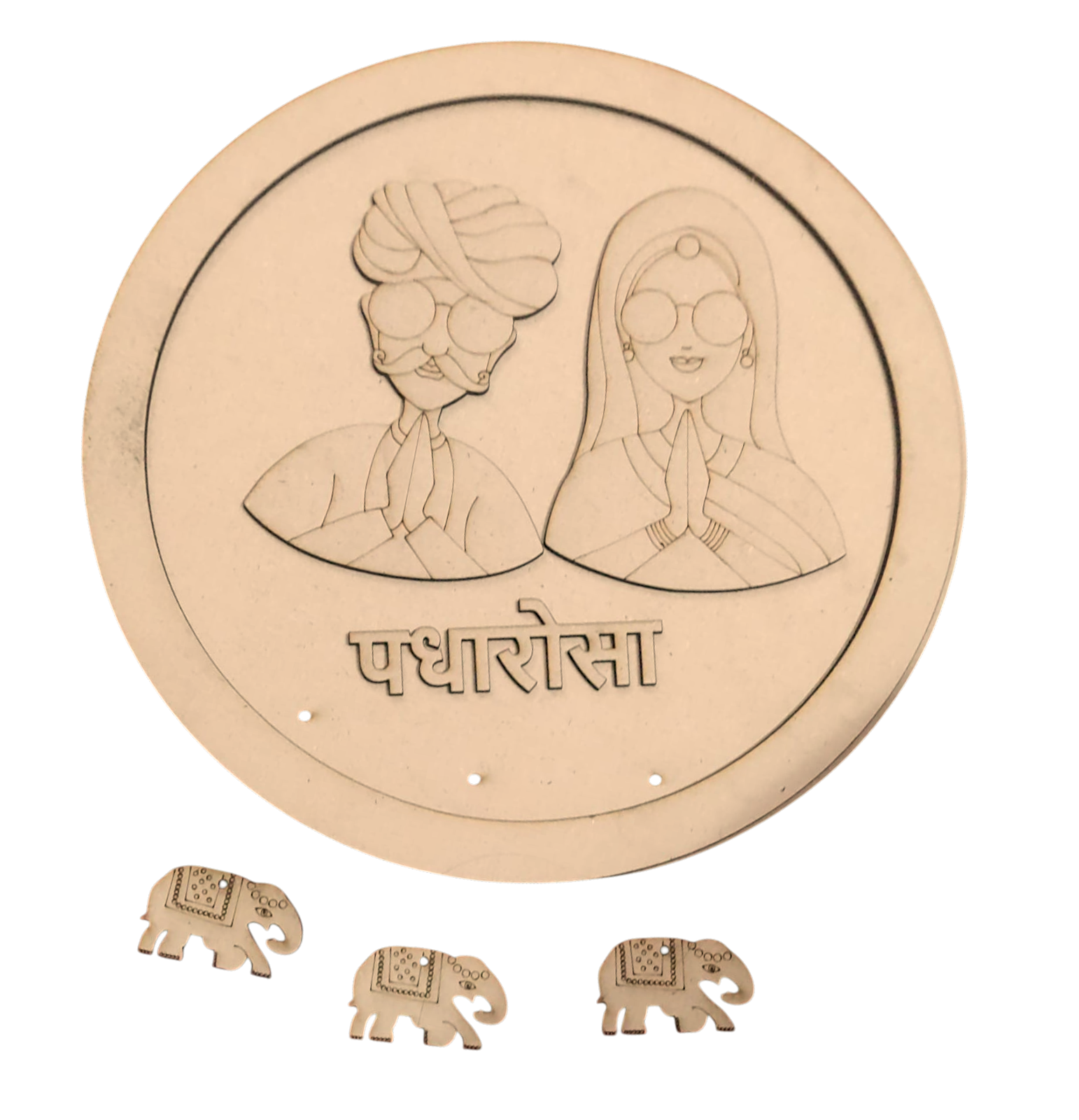 This Rajasthani Welcome Wooden Wall Hanging is crafted from premium MDF and features a traditional couple in greeting posture with the text “Padharo Sa.” The design reflects authentic Rajasthani culture and is perfect for decorating home entrances, offices, hotels, and festive setups.
